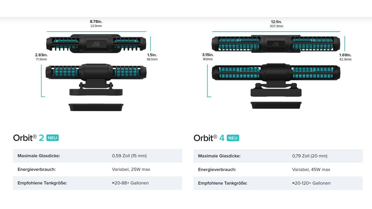 Die Orbit-Pumpen erzeugen eine einzigartige Bewegung im Aquarium, ähnlich der natürlichen Strömung des Ozeans. Sie schaffen eine Querströmung, die den Gezeitenstrom in Riffgebieten nachahmt und dabei überschüssige Nährstoffe vom Boden des Aquariums aufwirbelt, damit diese durch die Filterung entfernt werden können. Wie bei den Meeresströmungen ist es nicht nur eine Art von Strömung, sondern mehrere Strömungsarten, die das Riff gedeihen lassen. Kombiniert mit den Nero-Pumpen können Sie echte Meeresströmungen simulieren - kraftvoll, gerichtet, systematisch und chaotisch.