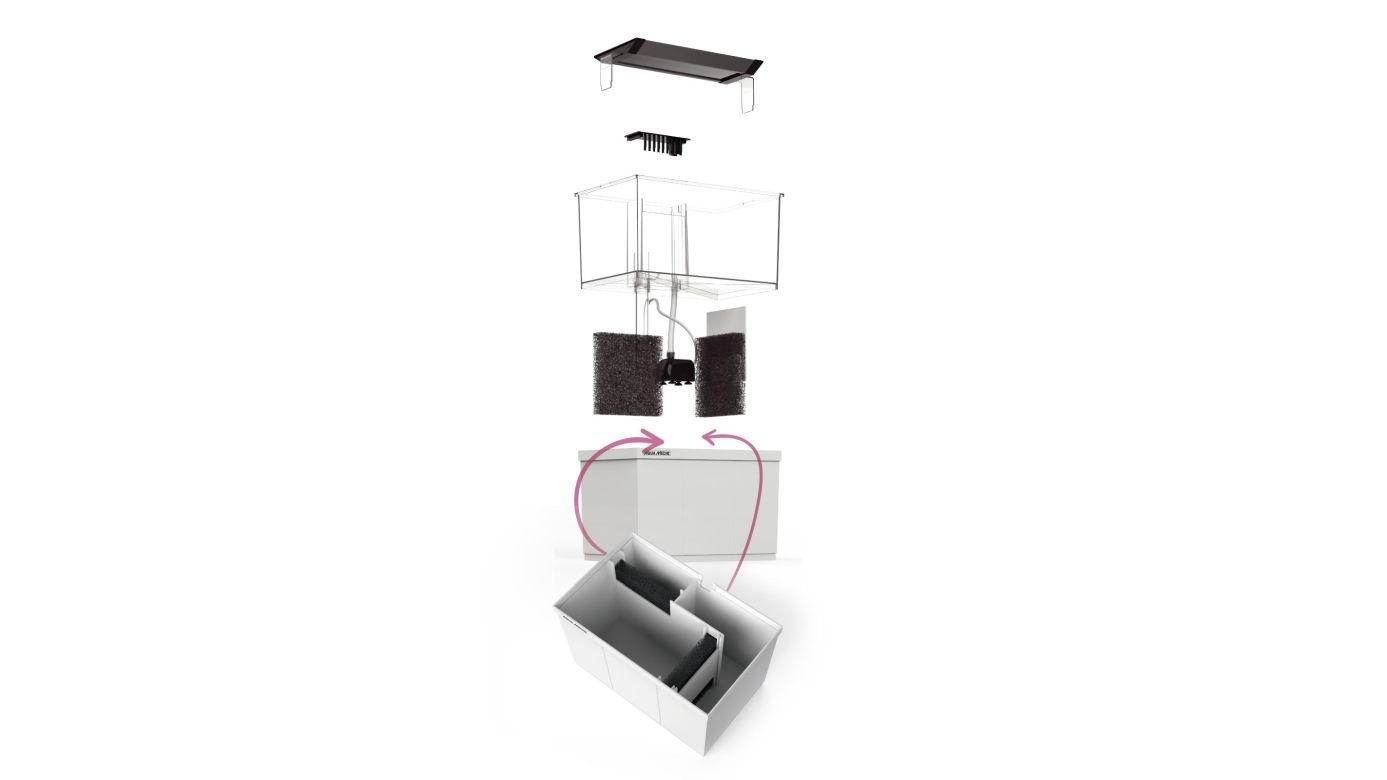 Die ausgeklügelte Wasserführung gewährleistet einen geräuscharmen Betrieb. Durch Filterschwämme, die im Unterschrank platziert werden können, wird für eine gute Wasserqualität gesorgt.