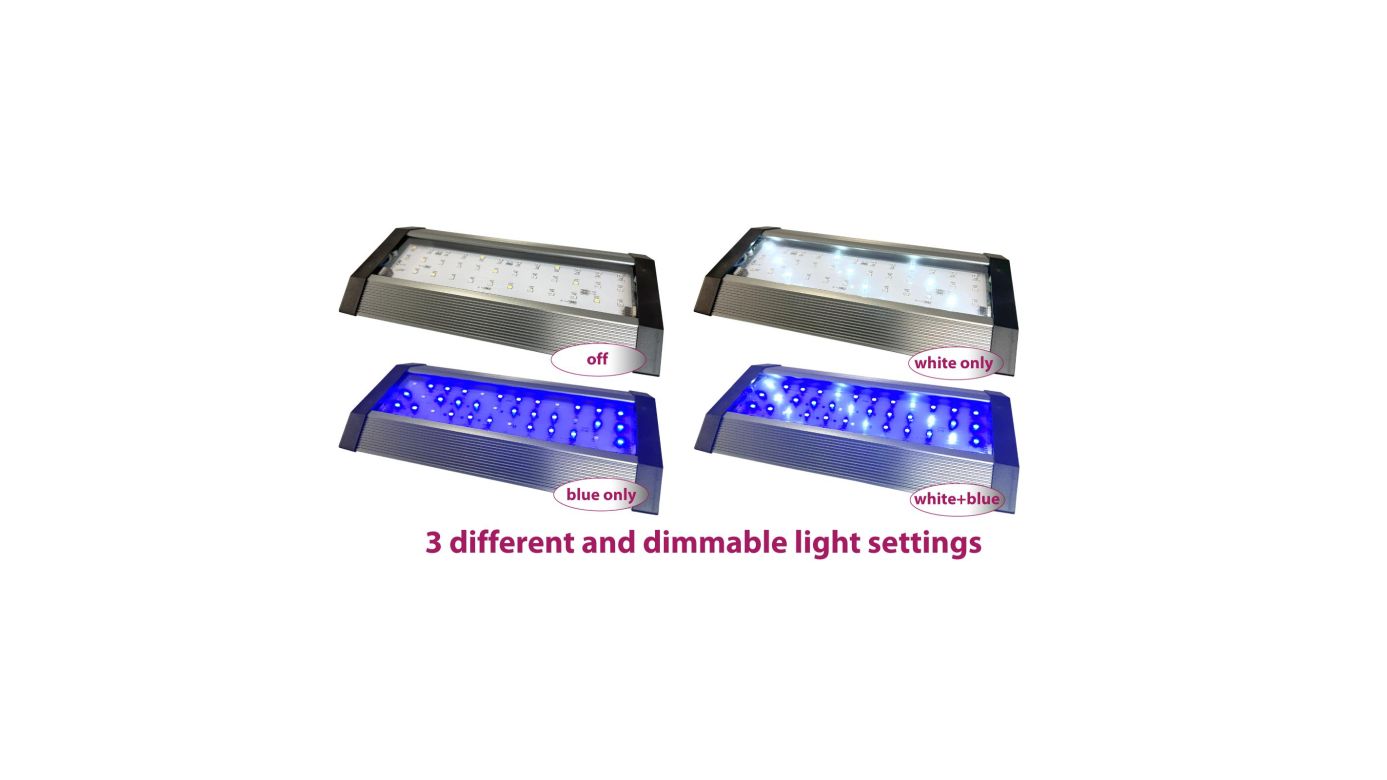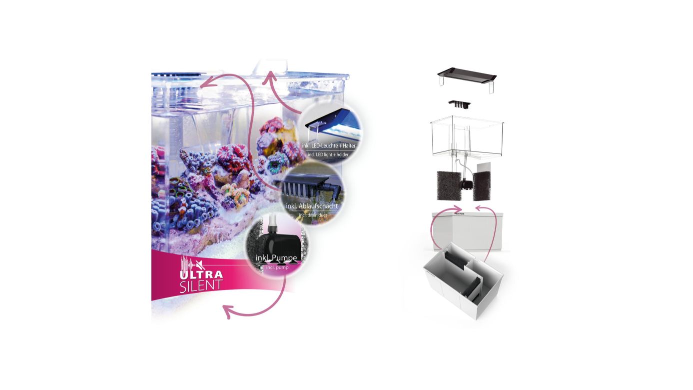Das Armatus XS wird mit LED Beleuchtung und Pumpe geliefert. Die LED Beleuchtung kann mit 2 Lichtkanälen (weiß und blau) inkl. Dimmung individuell angepasst werden. Die integrierte Förderpumpe dient ebenfalls als Strömungspumpe und sorgt für ausreichende Wasserumwälzung. Ein eingebauter Ablaufschacht stellt einen zuverlässigen Oberflächenabzug sicher.