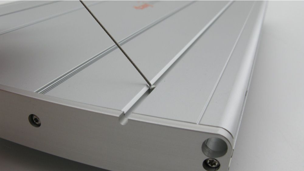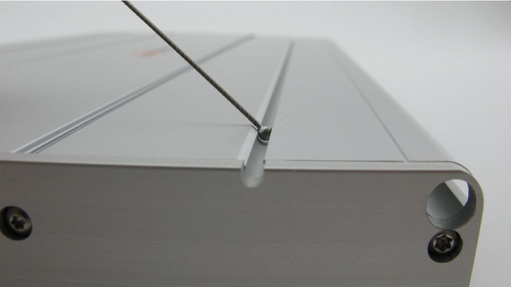 Filigrane Drahtseilaufhängung aus Edelstahl zur freien Aufhängung einer pendix Leuchte über dem Aquarium. Diese kann in der Höhe mühelos ohne Werkzeug verstellt werden. Zudem ermöglicht die „Delta-Verzweigung „eine exakt waagerechte Ausrichtung und Fixierung. Die Länge der Drahtseile beträgt 2 Meter.