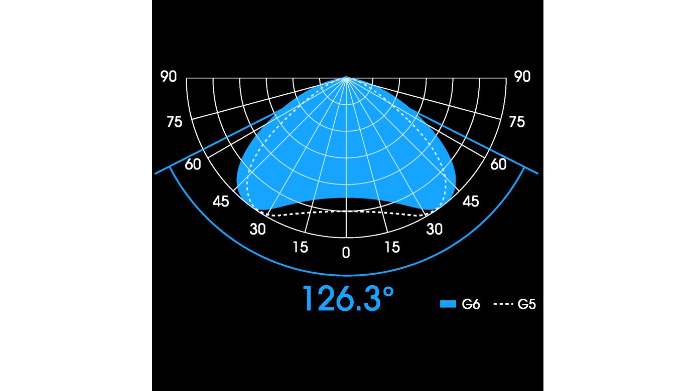Die Radion G6 erhöht den Output von beeindruckenden 110,5 Grad bei der G5 auf atemberaubende 126,3 Grad. Diese Verbesserung wurde durch eine Änderung der Primäroptik der LEDs erreicht, die dann mit der Geometrie der vorhandenen HEI (Hemispherically Edge Illuminating)-Sekundäroptik (Linse) integriert wird.