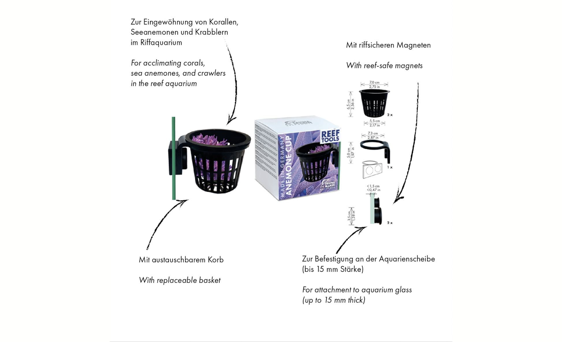 Inklusive riffsicherem Magnet zur Befestigung an der Aquarienscheibe (bis 15 mm Stärke) und Wechselkorb.
