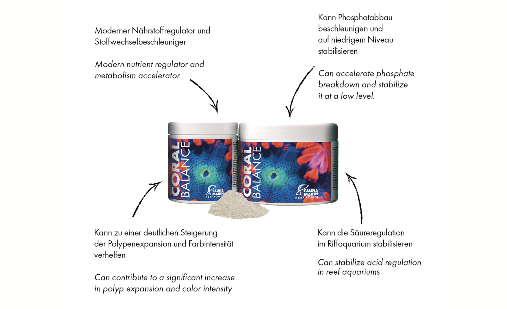 Coral Balance ist ein moderner Nährstoffregulator und Stoffwechselbeschleuniger, speziell entwickelt um in Riffaquarien den natürlichen Nährstoffkreislauf und Säureregulation zu reaktivieren und zu stabilisieren. Hierbei wird im besonderen der sonst nur schwer zu kontrollierende Phosphatabbau beschleunigt und auf niedrigem Niveau stabilisiert.