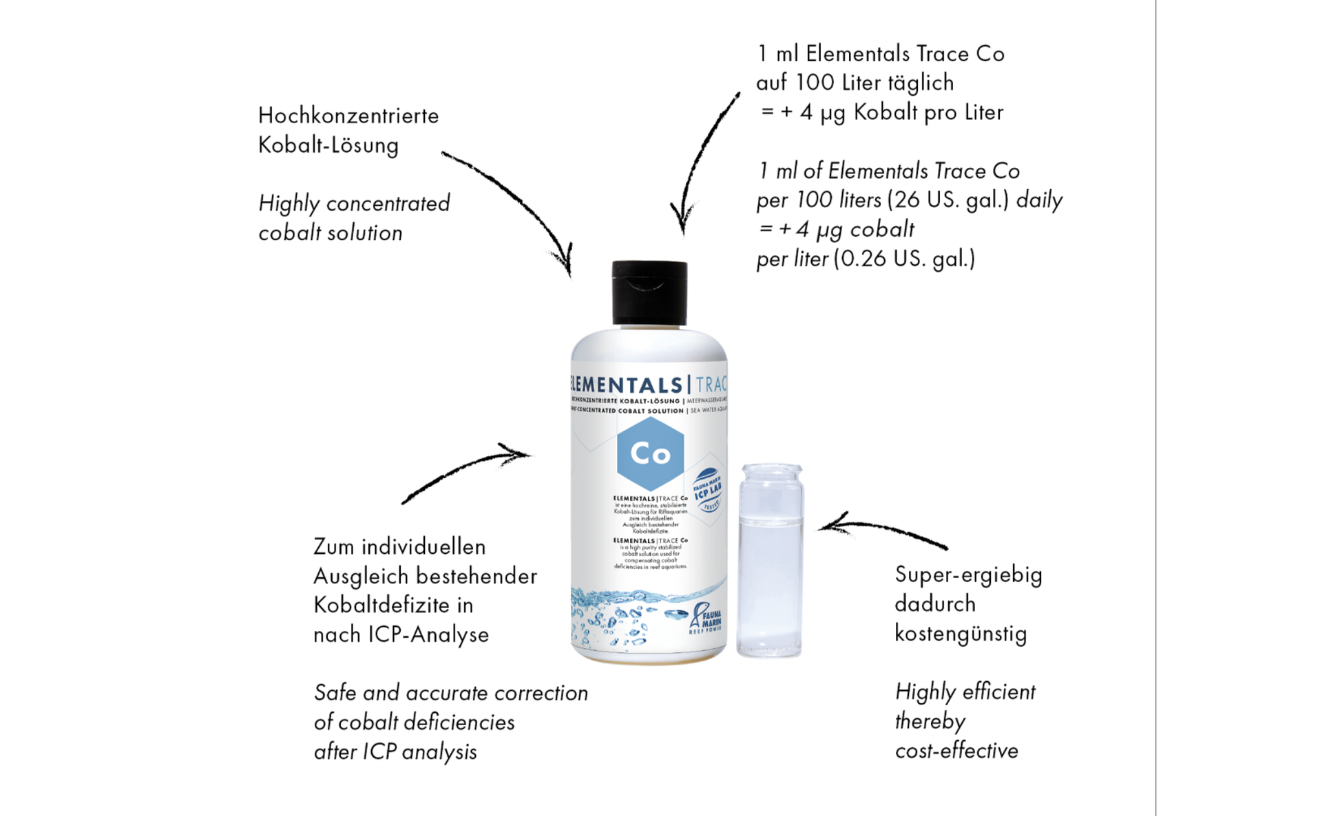 ELEMENTALS TRACE Co ist eine hochkonzentrierte Kobaltdlösung für Meerwasseraquarien zum individuellen Ausgleich bestehender Kobaltdefizite.