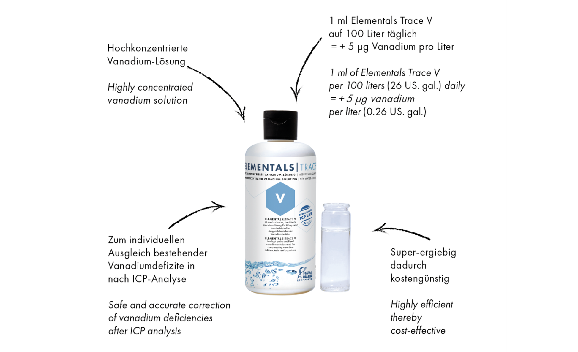 ELEMENTALS TRACE V ist eine hochkonzentrierte Vanadiumlösung für Meerwasseraquarien zum individuellen Ausgleich bestehender Vanadiumdefizite.