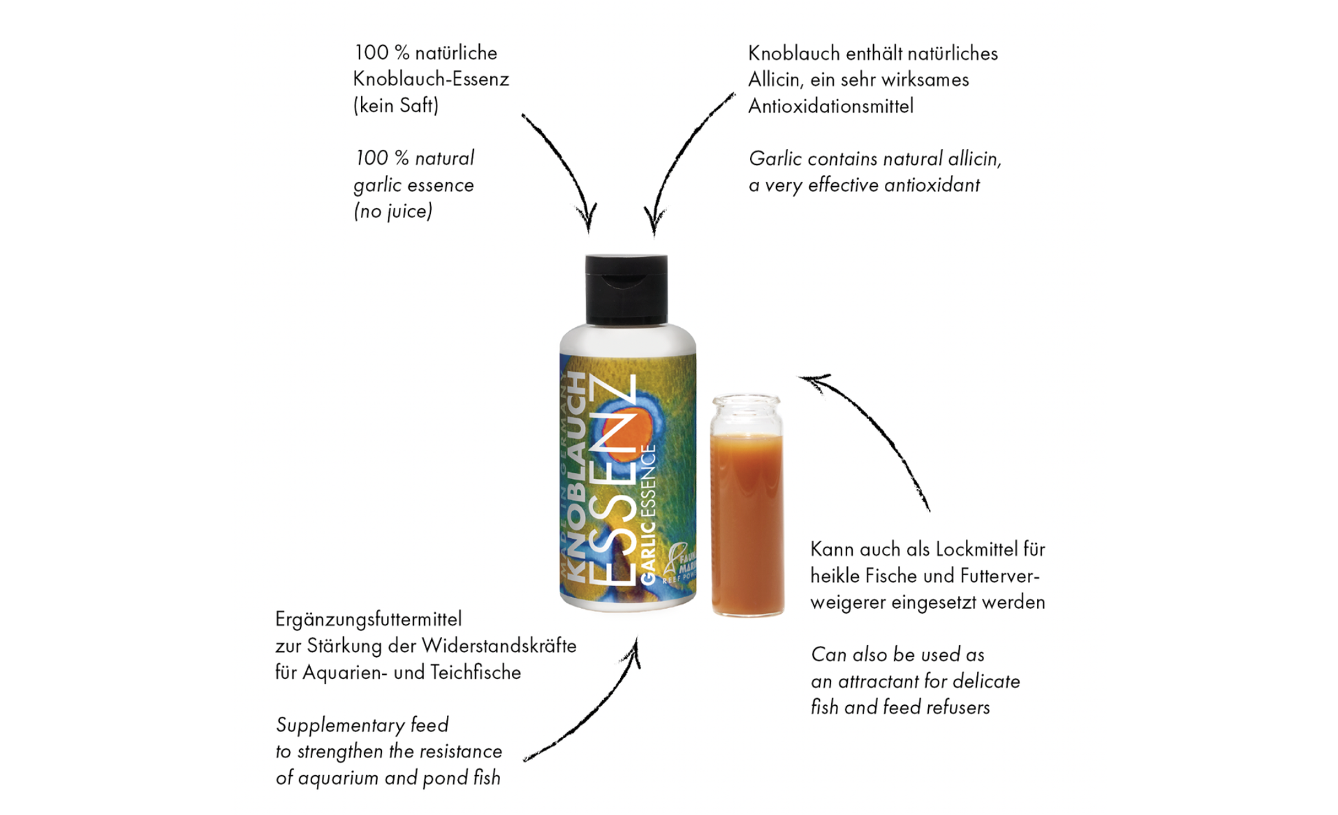 Fauna Marin Knoblauchextrakt ist ein Anregungsmittel und zur Stärkung der Widerstandskräfte für alle Aquarium- und Teichfische. Es dient auch als Lockmittel für heikle Fische und Futterverweigerer. Es handelt sich hierbei um einen echten Extrakt aus deutscher Produktion. Wir verwenden ausdrücklich kein Knoblauchöl!