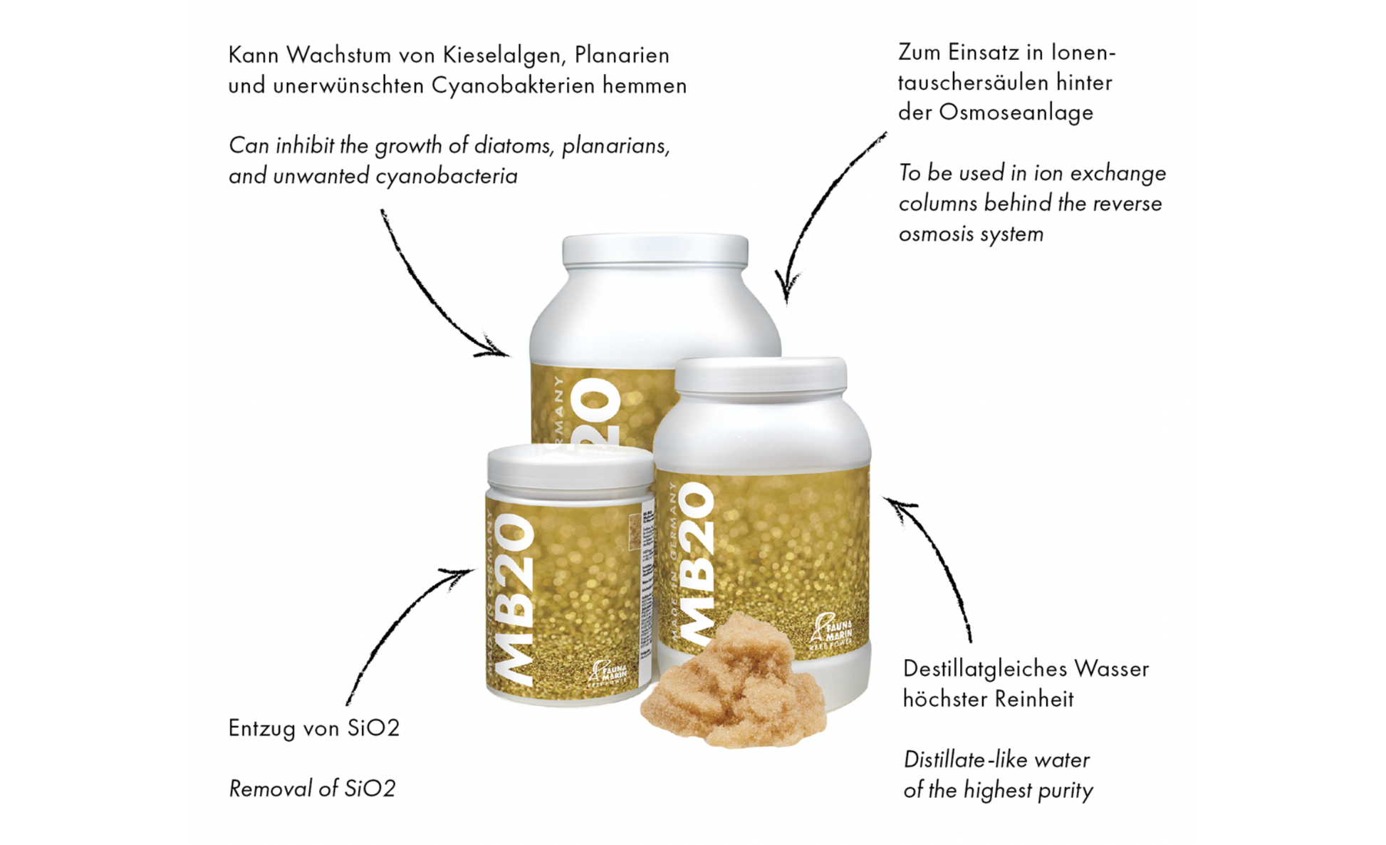 Faun Marin MB 20 stoppt Kieselalgen, Planarien und unerwĂĽnschte Cyanobakterien werden durch den Entzug von SiO2 nachhaltig gehemmt.