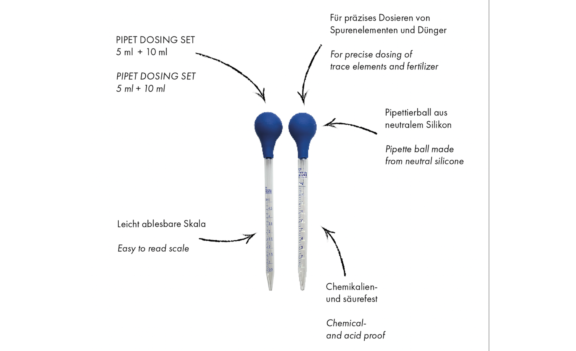 Das Pipet Dosing Set beinhaltet zwei hochwertige Glaspipetten mit Feineinteilung.