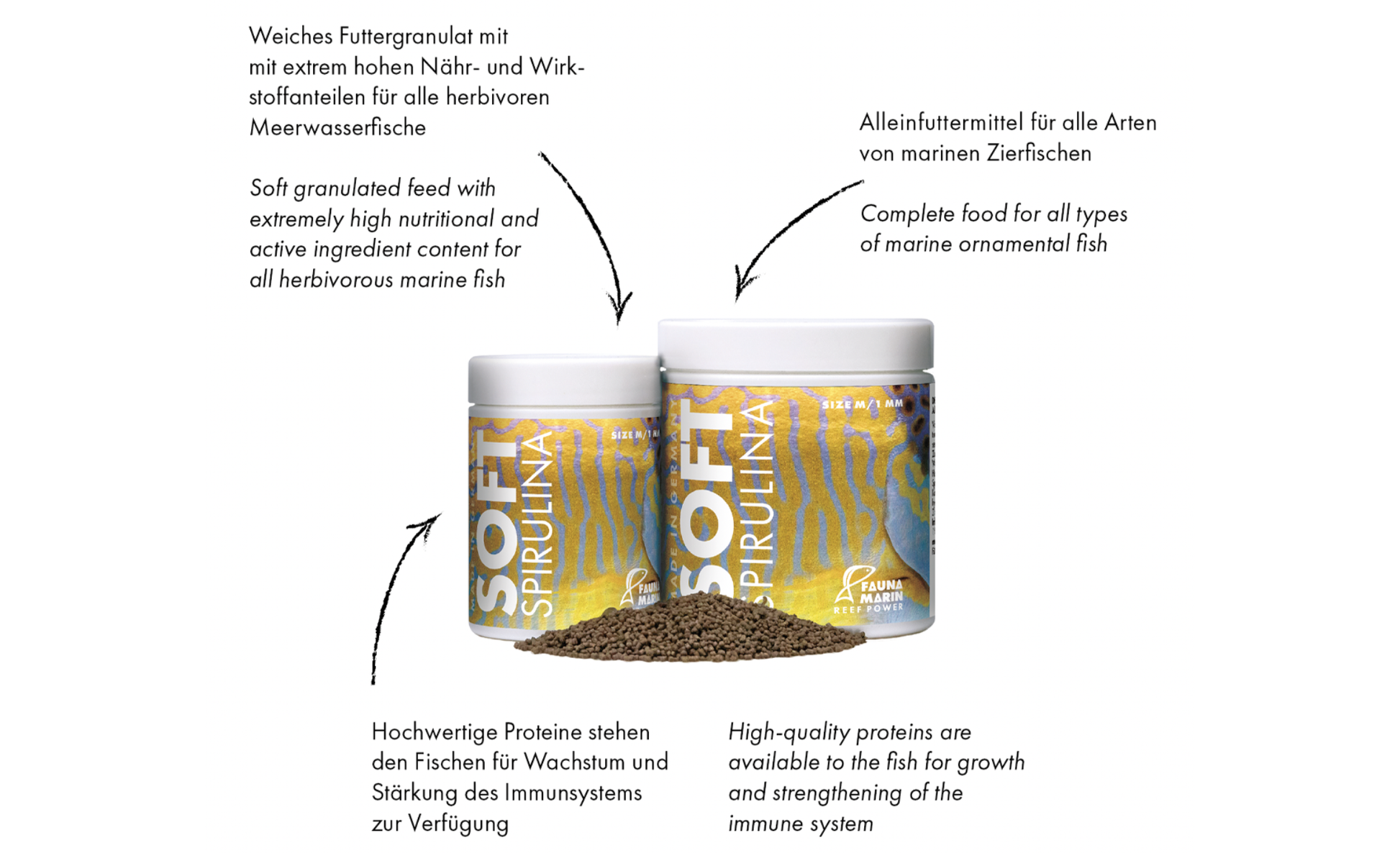 Fauna Marin Soft Spirulina ist ein weiches Granulat-Futter mit extrem hohen Nähr- und Wirkstoffanteilen für alle herbivoren Meerwasserfische.