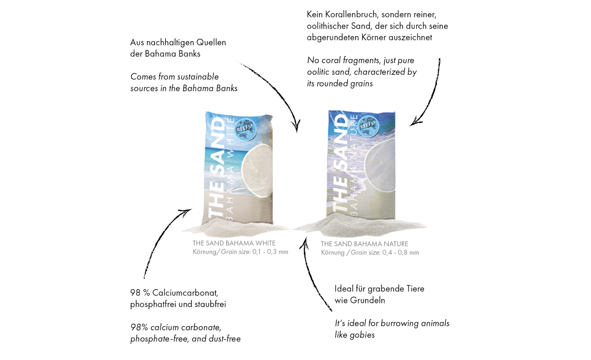 Unser Sand stammt aus nachhaltigen Quellen der Bahama Banks – kein Korallenbruch, sondern reiner, oolithischer Sand, der sich durch seine abgerundeten Körner auszeichnet. Diese Struktur ist nicht nur ästhetisch, sondern auch funktional: Ideal für grabende Tiere wie Grundeln, die diesen Sand besonders schätzen werden.