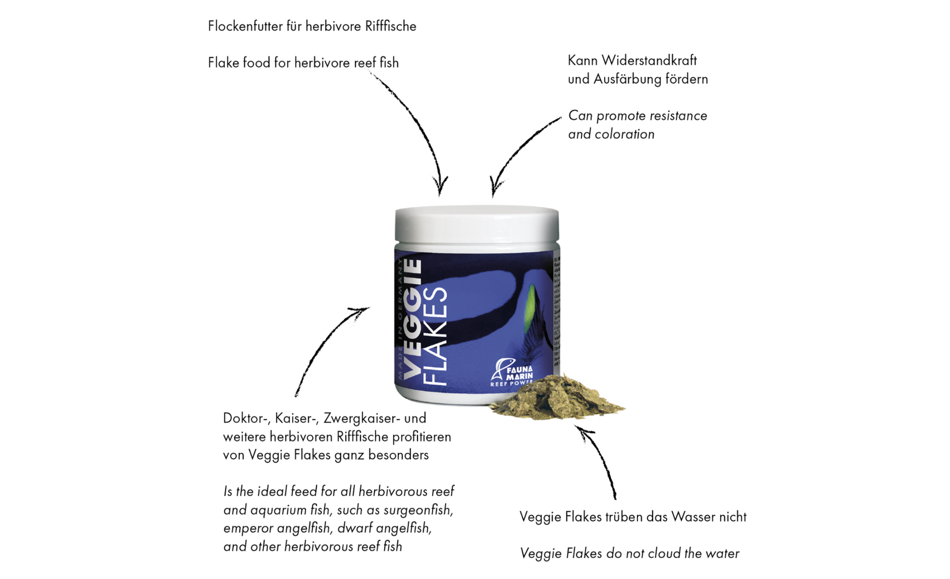 Fauna Marin Veggie Flakes ist fu¨r alle herbivoren Riff- und Aquarienfische, wie Doktor-, Kaiser-, Zwergkaiser- und weitere herbivoren Rifffische.