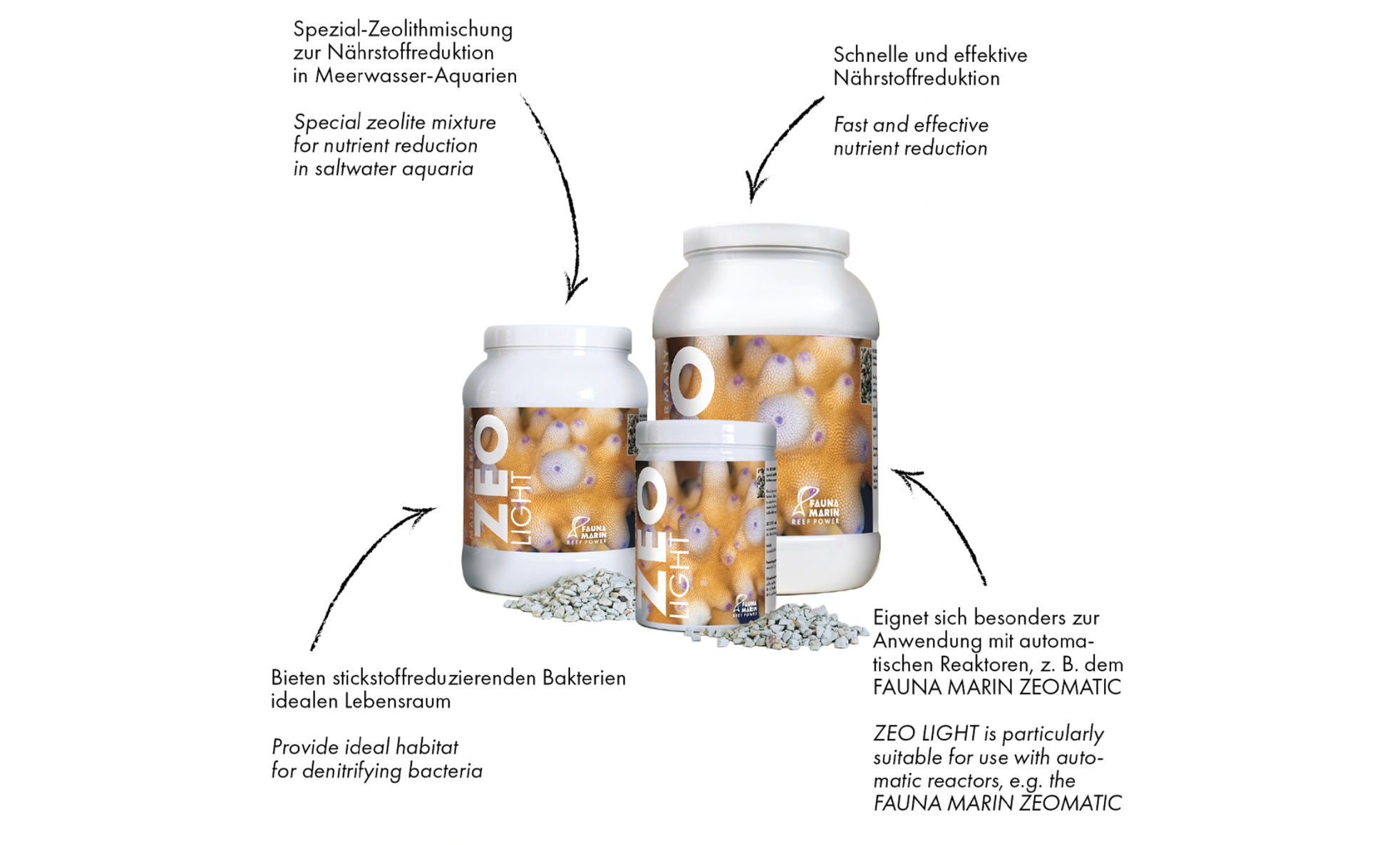 Diese Spezial-Zeolithe bieten stickstoffreduzierenden Bakterien einen idealen Lebensraum. Durch die ausgesuchten chemischen und physikalischen Eigenschaften unserer Zeolithe ist eine schnelle und effektive Nährstoffreduktion gewährleistet.