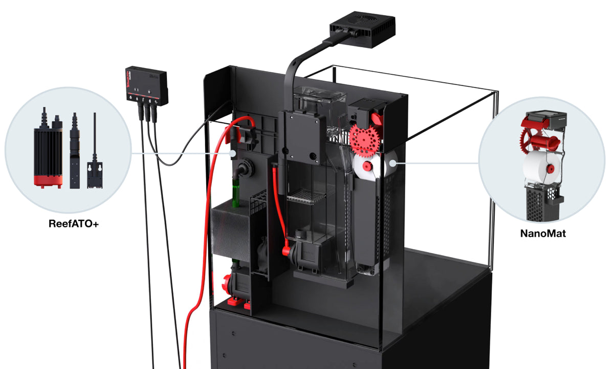 Der hintere Technikabteil ist NanoMat-bereit, sodass Sie eine verbesserte mechanische Filterung und kristallklares Wasser genießen können. Der hintere Technikabteil ist ebenfalls ReefATO+-bereit und stellt sicher, dass das Wasservolumen konstant und der Salzgehalt stabil bleibt. Beide optionalen Zusätze müssen separat erworben werden. NanoMat wird später im Jahr verfügbar sein.