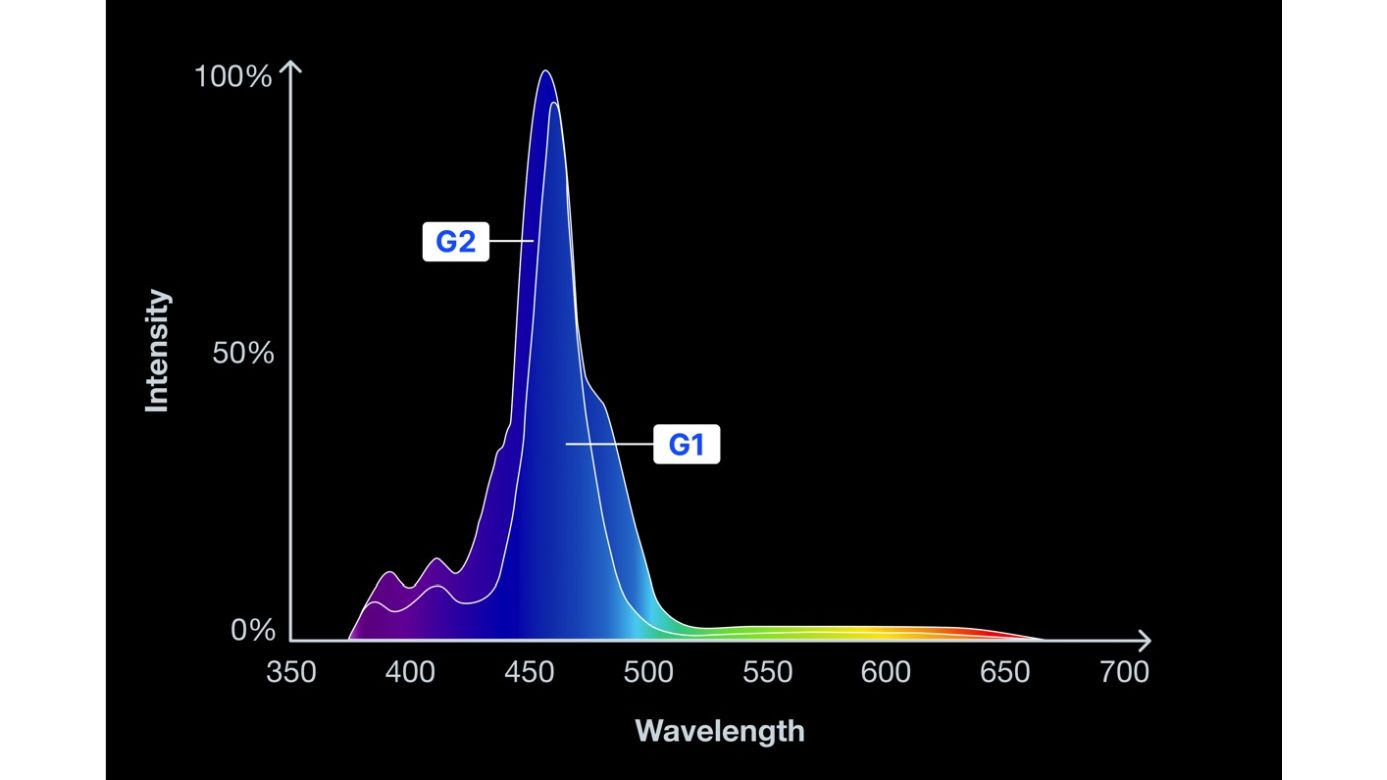 Lernen Sie die ReefLED G2 60, die ReefLED G2 115 und die ReefLED G2 170 kennen, die mehr Leistung, mehr Glanz und mehr Optionen bieten. Sie profitieren von einem völlig neuen Chipsatz in ihren kompakten Arrays, der ein reichhaltigeres Spektrum liefert, und können von 10.000 K Riffweiß auf 23.000 K Blau eingestellt werden, alles bei voller Intensität, was beim G1 nicht verfügbar war. Ihr charakteristisches REEF-SPEC-Blau wurde außerdem mit Violett und Ultraviolett erweitert und am oberen Ende des Spektrums auf 470 nm Blau verstärkt, wodurch Fische und Korallen wirklich strahlen.