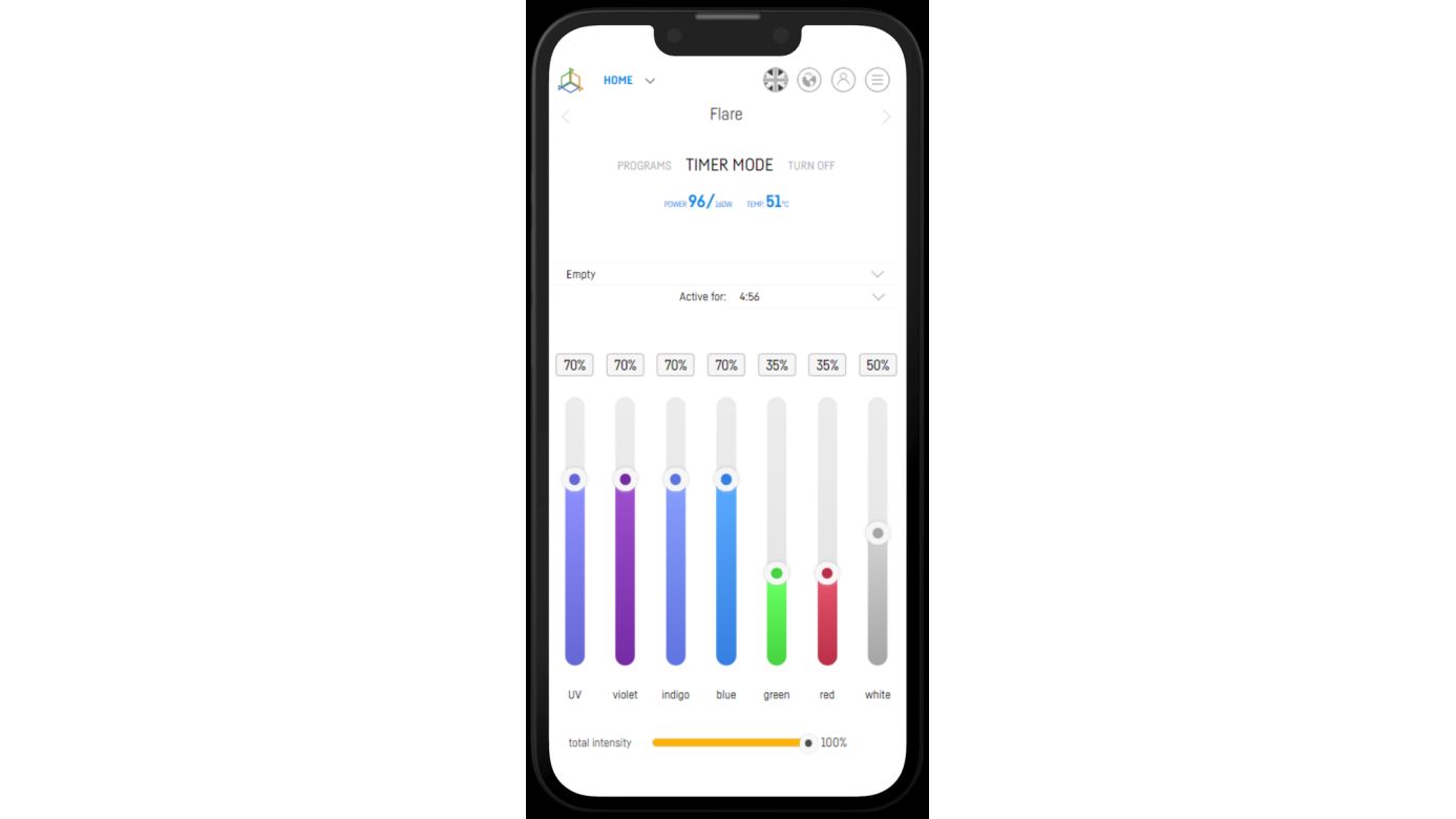 Ein neues, verbessertes Lichtmanagement-Panel. Größere Schieberegler und die Möglichkeit, den Prozentsatz der einzelnen Farbkanäle einzugeben. Außerdem wurde ein Leistungsregler hinzugefügt, mit dem Sie bei der Programmierung ganz einfach die Gesamtintensität des Lichts über alle Kanäle hinweg einstellen können.