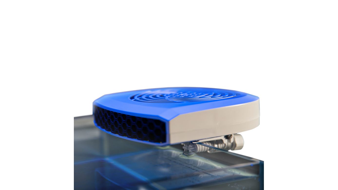 Durch seine spezielle Bauweise wird eine gezielte Strömung über weite Distanzen erreicht. So reicht schon ein Lüfter, um auch große Aquarien effizient zu kühlen.