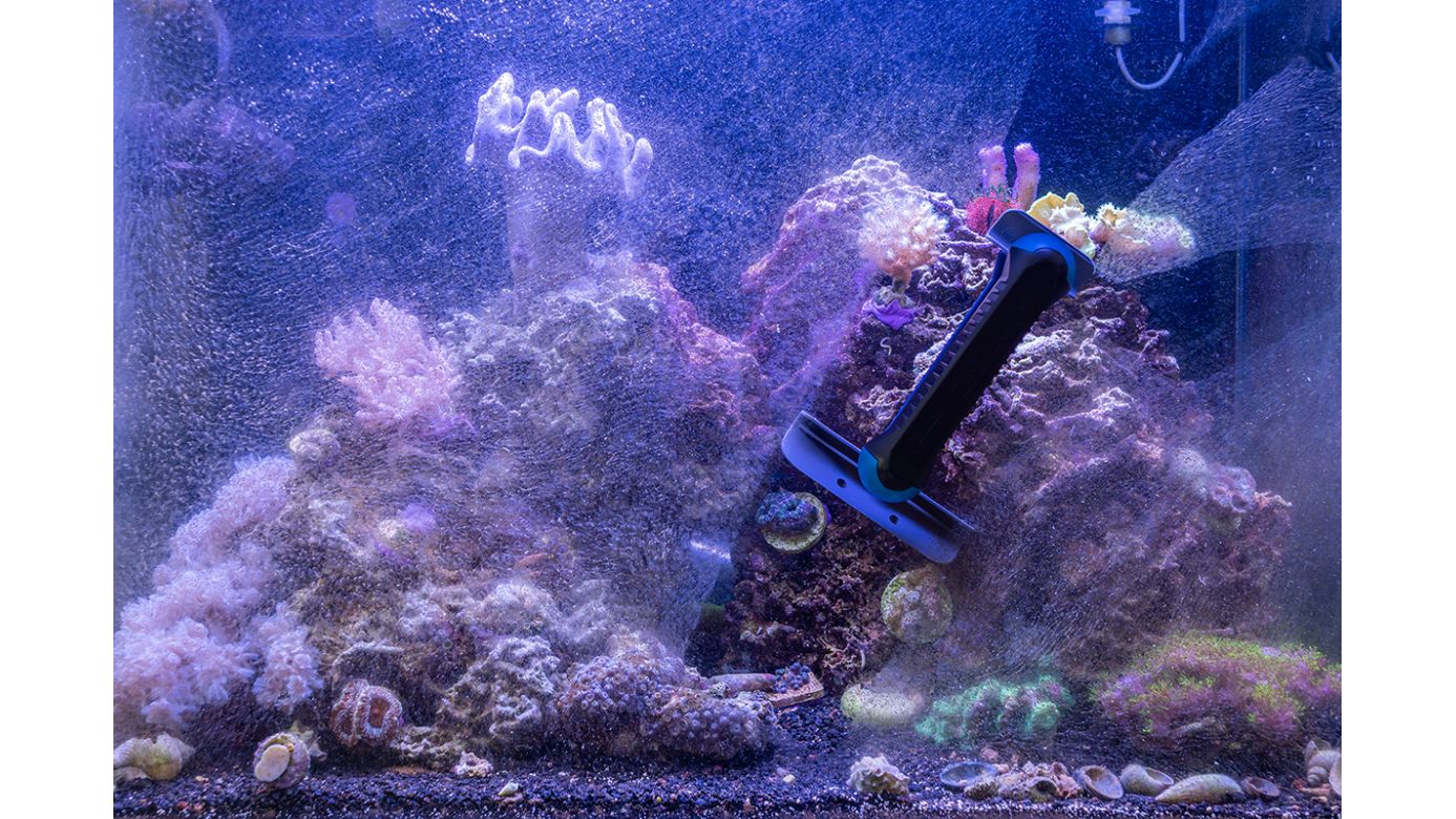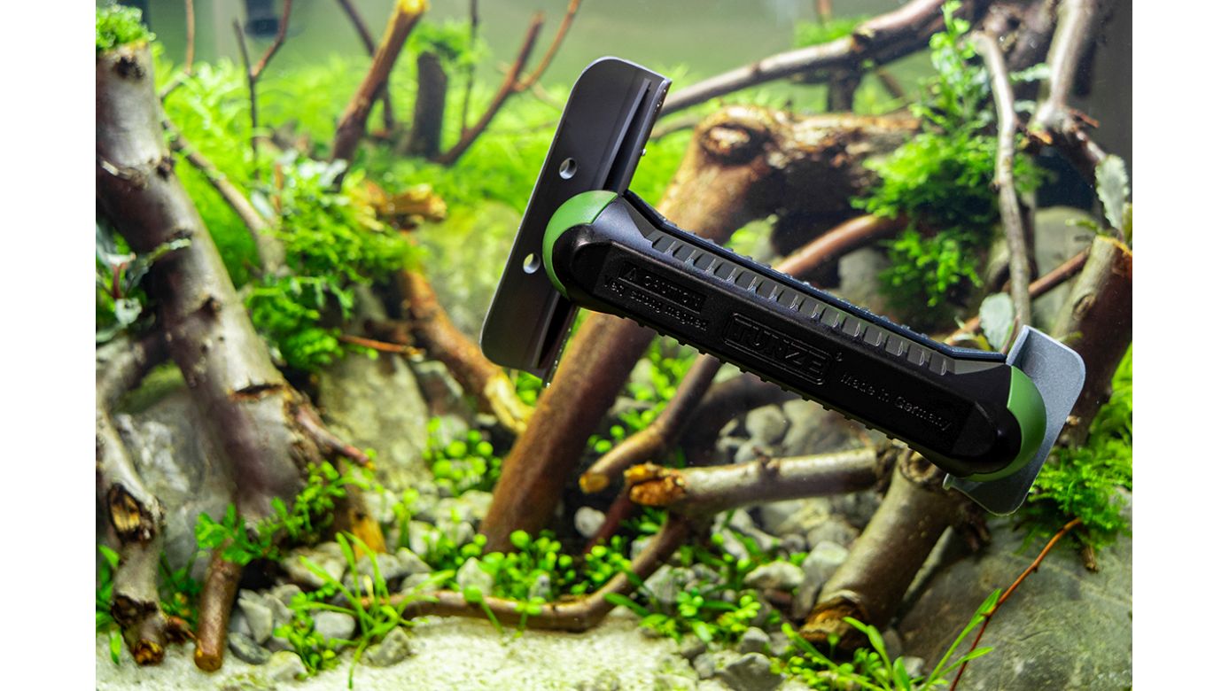 Nur bei Glas-Aquarienscheiben mit besonders harten Algen, z.B. älteren Ablagerungen an seitlichen Wänden oder dicken Kalkrotalgen, sollte die große Klinge mit der speziell mitgelieferten Edelstahlklinge erweitert werden.