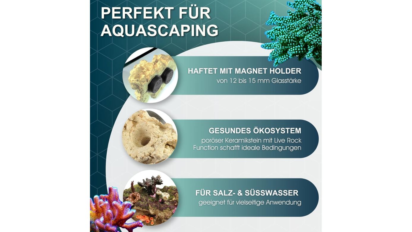 - Besteht aus sehr porösem Keramikstein mit Live Rock Function und verfügt über Vertiefungen für rund 8 Korallenableger, sowie für Reef Plugs (circa ø11 mm)