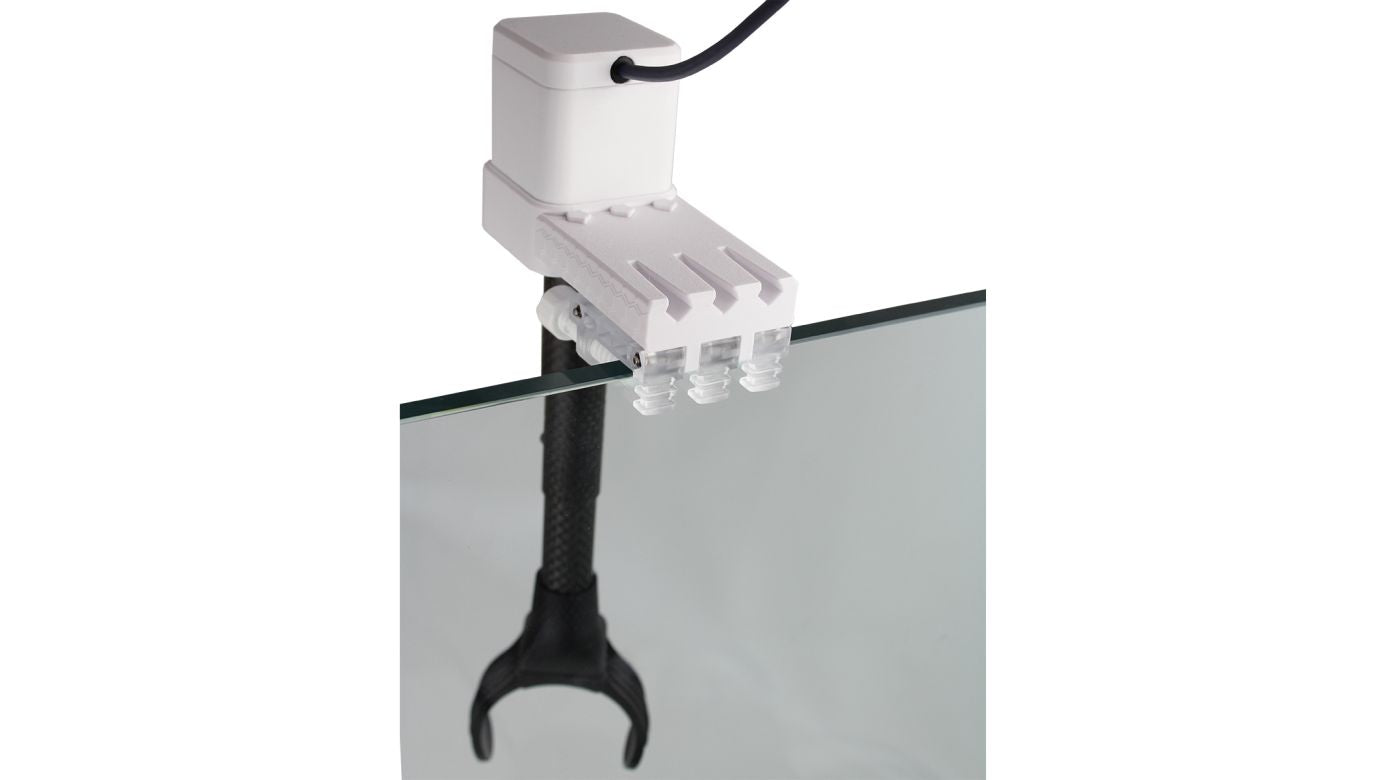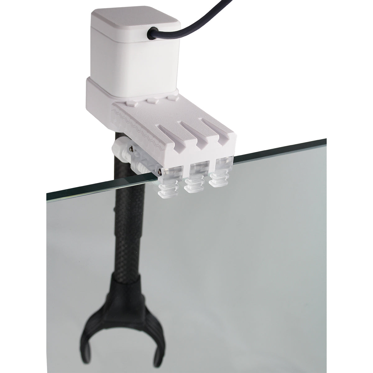 Der mitgelieferte Halter passt sowohl für Poolbecken als auch für Aquarien mit Glasstegen. Die Installation erfolgt werkzeuglos, sicher und flexibel.
